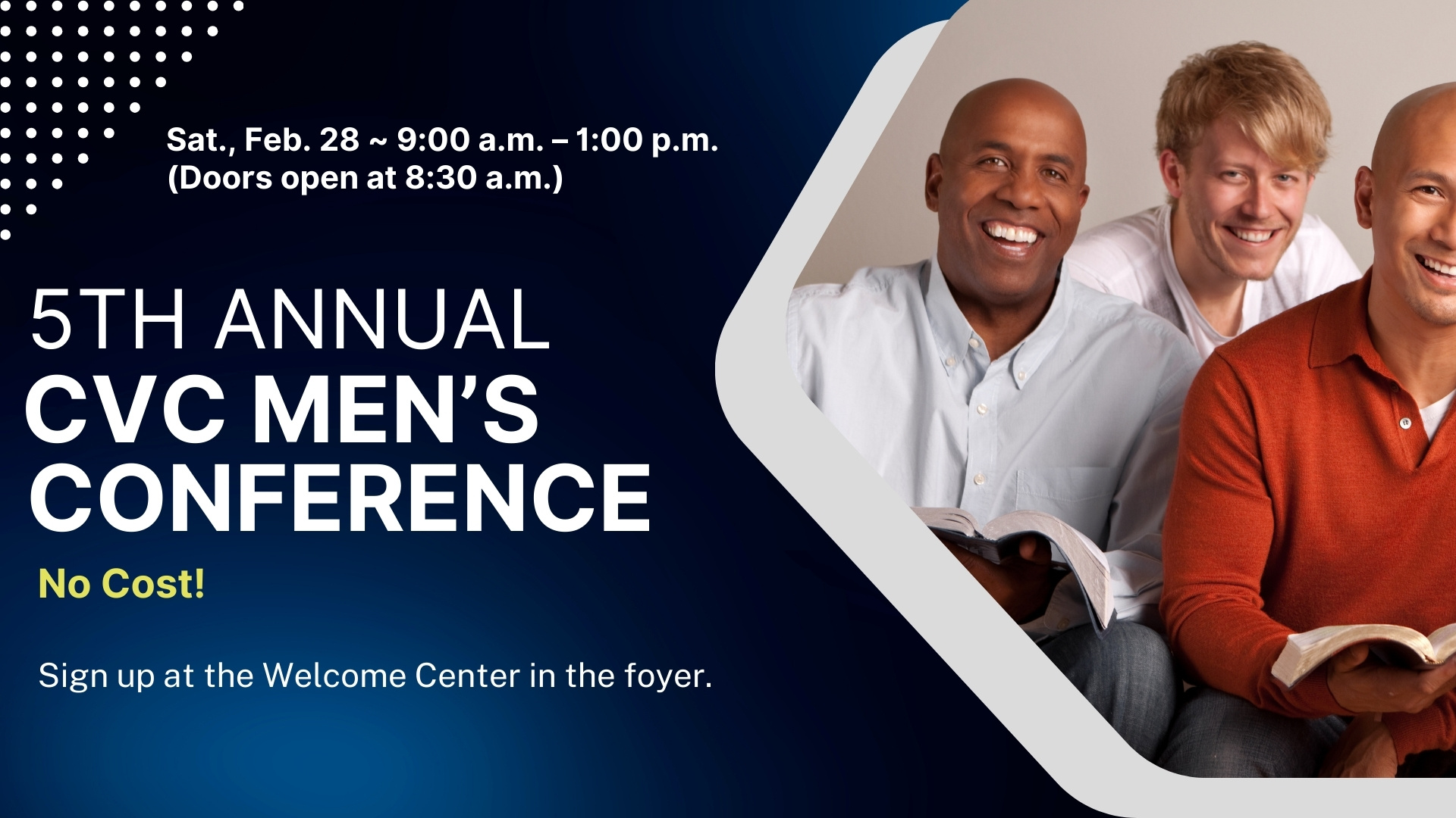 CVC Men, mark your calendar for this half-day event. This will be an opportunity for you to dig deeper with one another and with God. A light breakfast and a pizza lunch will be provided. There is no cost to attend. More information to come.